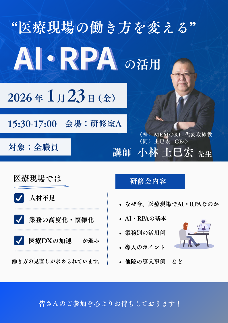 2026年1月23日(金)、札幌市内の病院(600床超)にて『”医療現場の働き方を変える”AI・RPA活用』(院内勉強会)講師を務めさせていただきました。当日は75名程の病院職員(医師、看護師、コメディカル、医事課、連携課、管理部門など)に参加いただきました。勉強会後、早速、看護師、医事課、リハビリ課から、AI・RPA導入について前向きな意見交換ができ、次回(2/27(金))訪問時に、現業の課題について、各課からヒアリングさせていただく運びとなりました。職員の積極的な意見に、逆に、驚かされました。AI(ChatGPT、Gemini、Copilot)のプロンプト事例、RPA事例について、メールやSNSでやり取り(情報交換)サポートをスタートさせていただいてます。こうした積極的な取組が、「DX(デジタル・トランスフォーメーション)」の「X(トランスフォーメーション)」の実現に繋がっていくのだと、確信しています。今後も、全力で「DX基盤」の定着化に寄与して参ります。